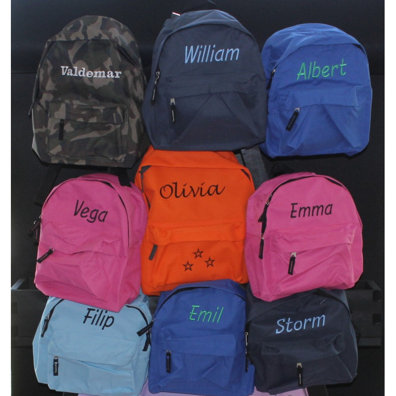 Barnets navn broderes foran på tasken, og der kan tilvælges et motiv – for eksempel hjerter eller stjerner – som giver et personligt præg. Du kan vælge trådfarve og skrifttype, så broderingen passer til barnets stil og yndlingsfarve.