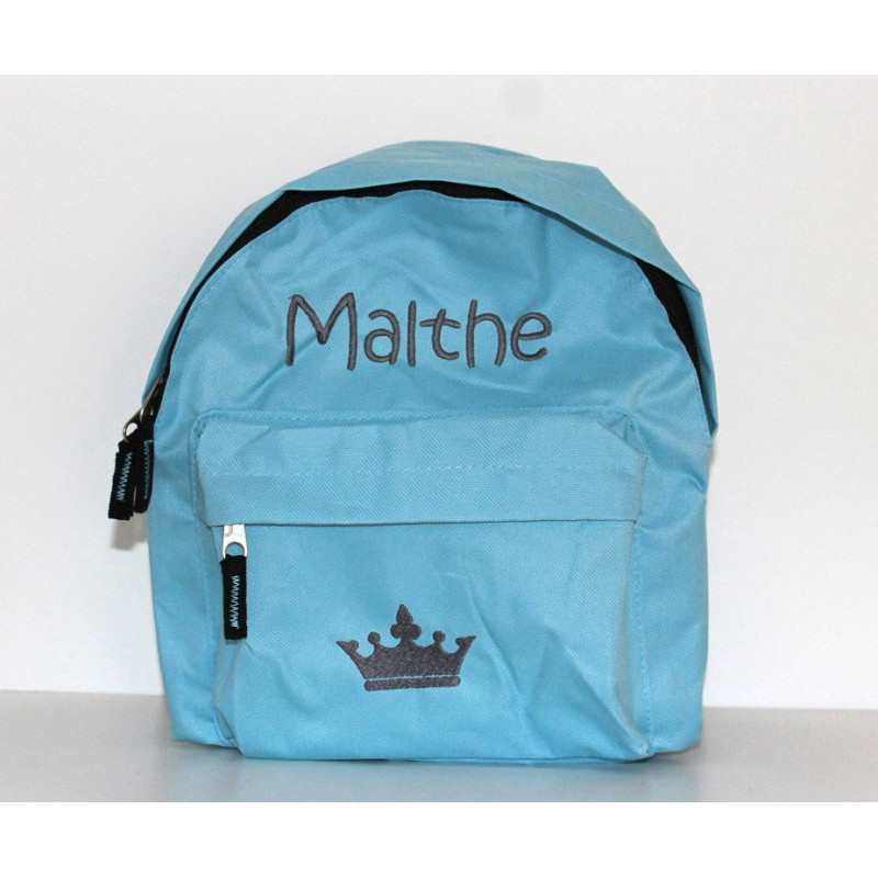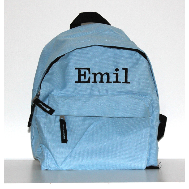 En lyseblå børnetaske, hvor barnets navn broderes direkte på tasken. Tasken måler 29 x 23 x 12 cm og passer børn på ca. 2–6 år. Den er velegnet som tur- eller hverdagstaske til børnehave, vuggestue eller dagpleje.